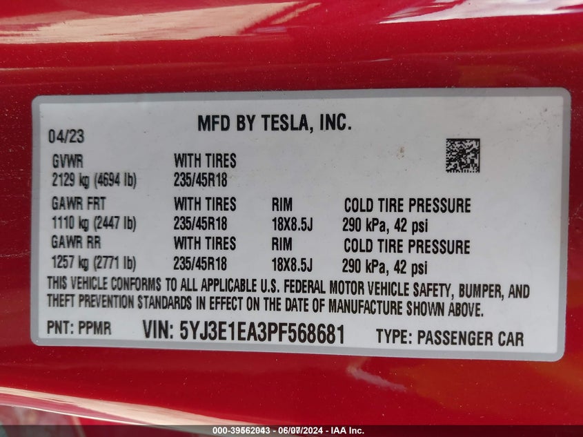 VIN: 5YJ3E1EA3PF568681
